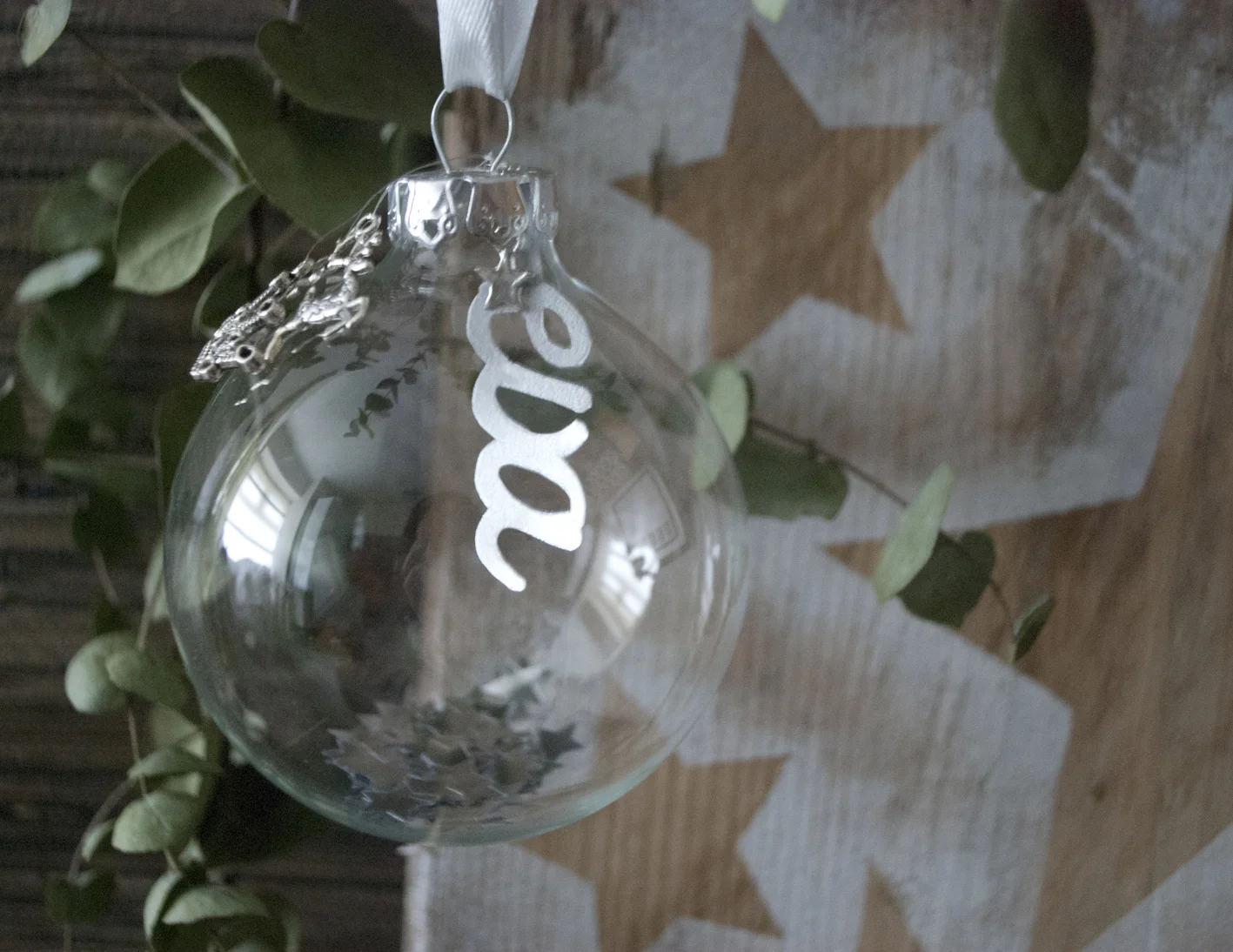 You can make these baubles even simpler – if you feel the cutting out is too tricky, you could use letter stamps or stickers to create the name onto a strip of card, or you could even just use an initial letter charm to make it super easy!